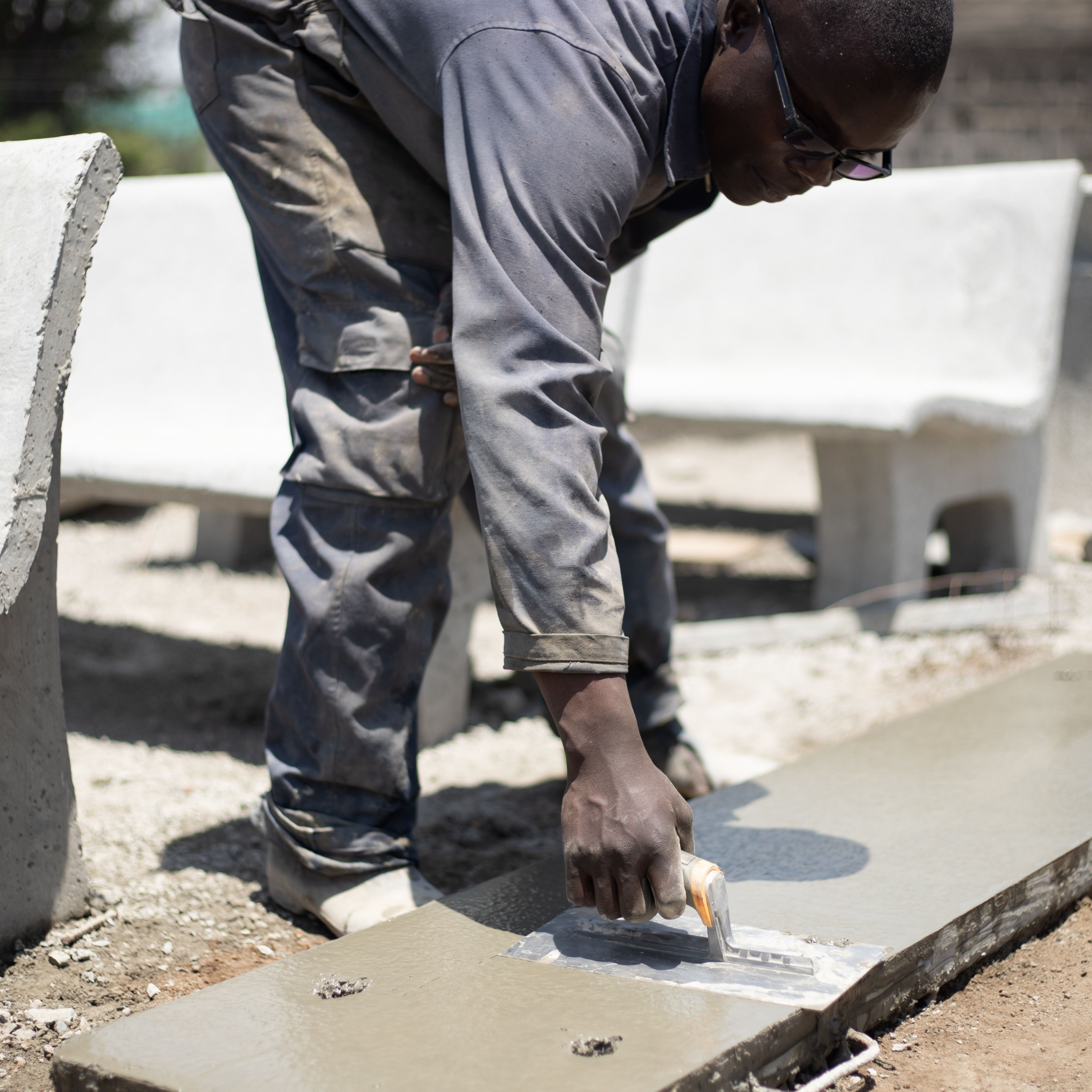 Concrete is a hardened building material created by combining a chemically inert mineral aggregate (usually sand, gravel, or crushed stone), a binder (natural or synthetic cement), chemical additives, and water. Although people commonly use the word "cement" as a synonym for concrete, the terms in fact denote different substances: cement, which encompasses a wide variety of fine-ground powders that harden when mixed with water, represents only one of several components in modern concrete. As concrete dries, it acquires a stone-like consistency that renders it ideal for constructing roads, bridges, water supply and sewage systems, factories, airports, railroads, waterways, mass transit systems, and other structures that comprise a substantial portion of the U.S. wealth.